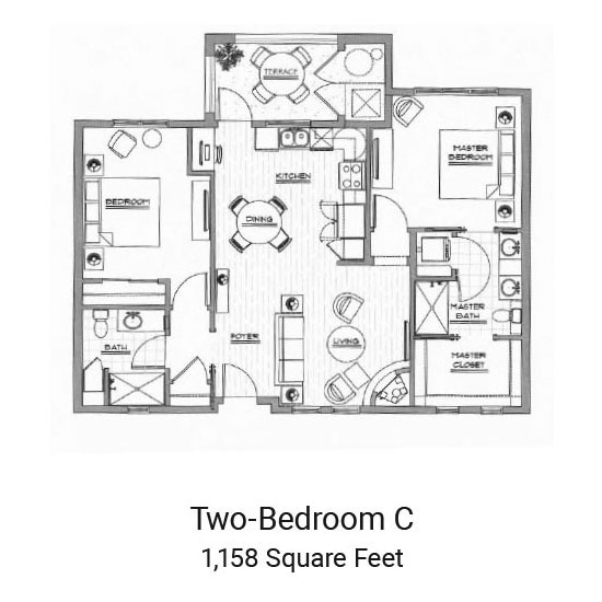 Choose from one- or two-bedroom options, with two bathrooms or one bath and powder room. Each residence boasts a balcony or patio.