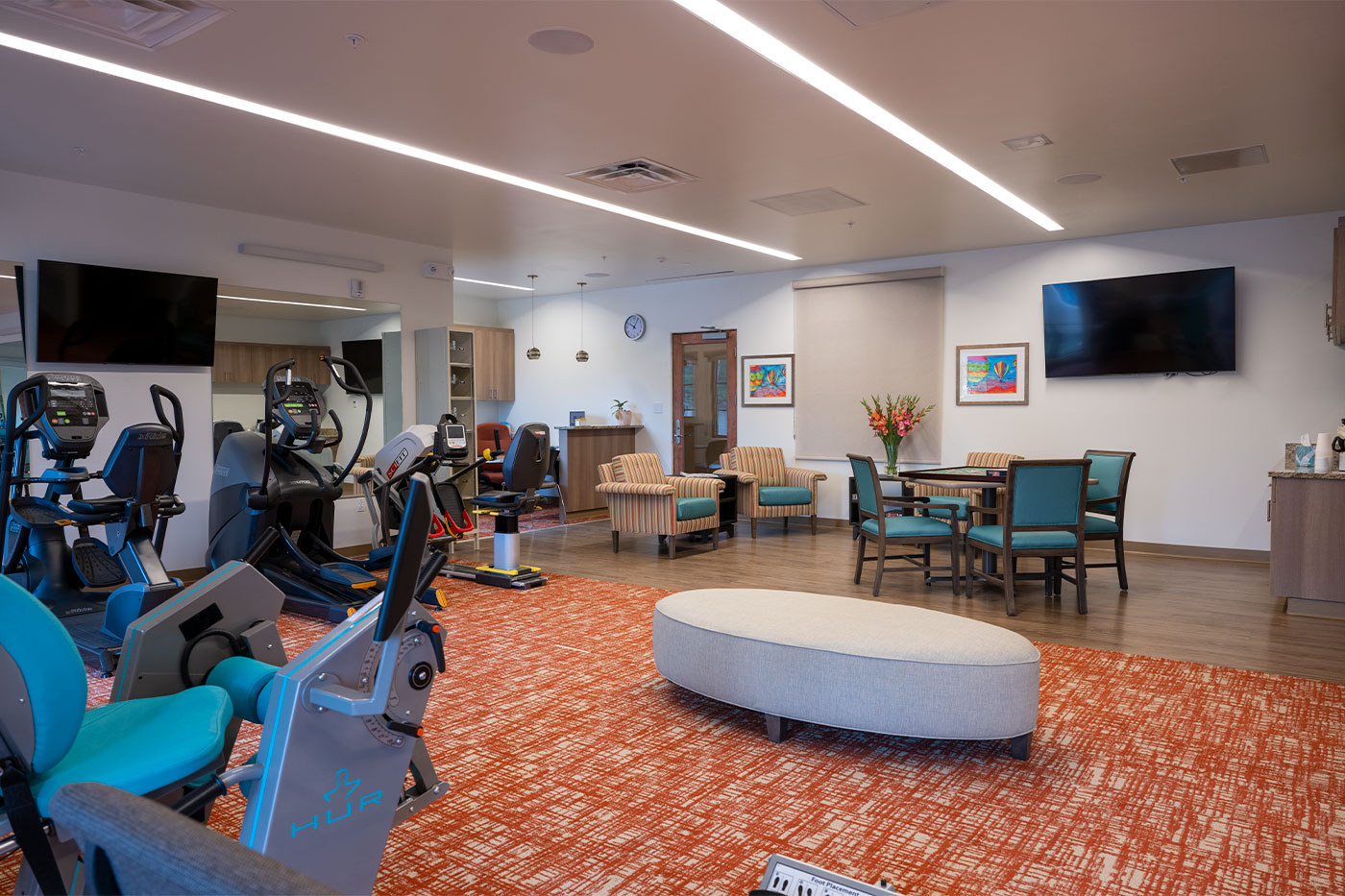 El Castillo and La Secoya offer on-campus private fitness centers with a mix of cardio, free weights, stretching, and air-resistance, weight-training equipment. The purpose of the fitness center is to improve residents’ physical wellbeing, mobility, and independence. Physical fitness also reduces the risk of fall injuries and contributes to a better quality of life.